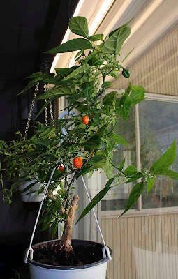 Nelivuotias Habanero siirtyi joustavasti parvekkeelta sisäkasvatukseen. Sadonkorjuun ja oksien leikkauksen jälkeen toin sen lämpimään lokakuulla ja sehän jatkoi kukkimistaan ja raakileitakin syntyi jo marraskuun alussa. Reilu kuukausi myöhemmin nuo kypsyvät.