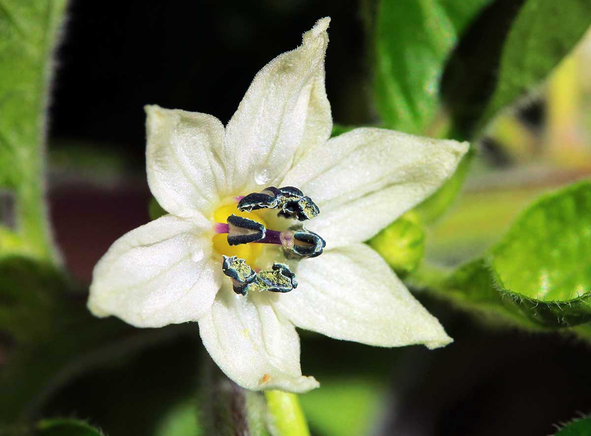 Cajamarcan kukka on 22 mm leveä, mutta läheltä kuvattuna täyttää kuvan. Vaihtelua noissakin on aika paljon, kuten kaikissa muissakin. Koko riippunee myös kasvuoloista. Tuossa näkyy hyvin chinenselle tyypillinen heteen varren (palhon) violetti väri.
